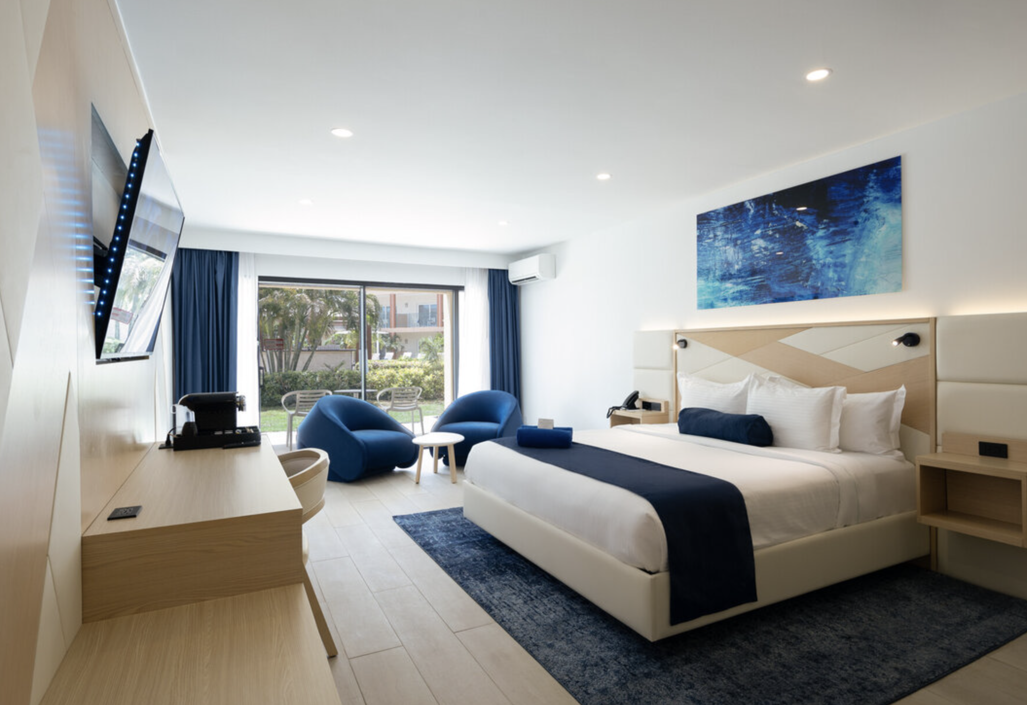 Bright and comfortable pool facing guest room with a king bed, modern Caribbean decor, and a furnished patio or balcony near the main pool areas. Approx. 440 sq. ft.