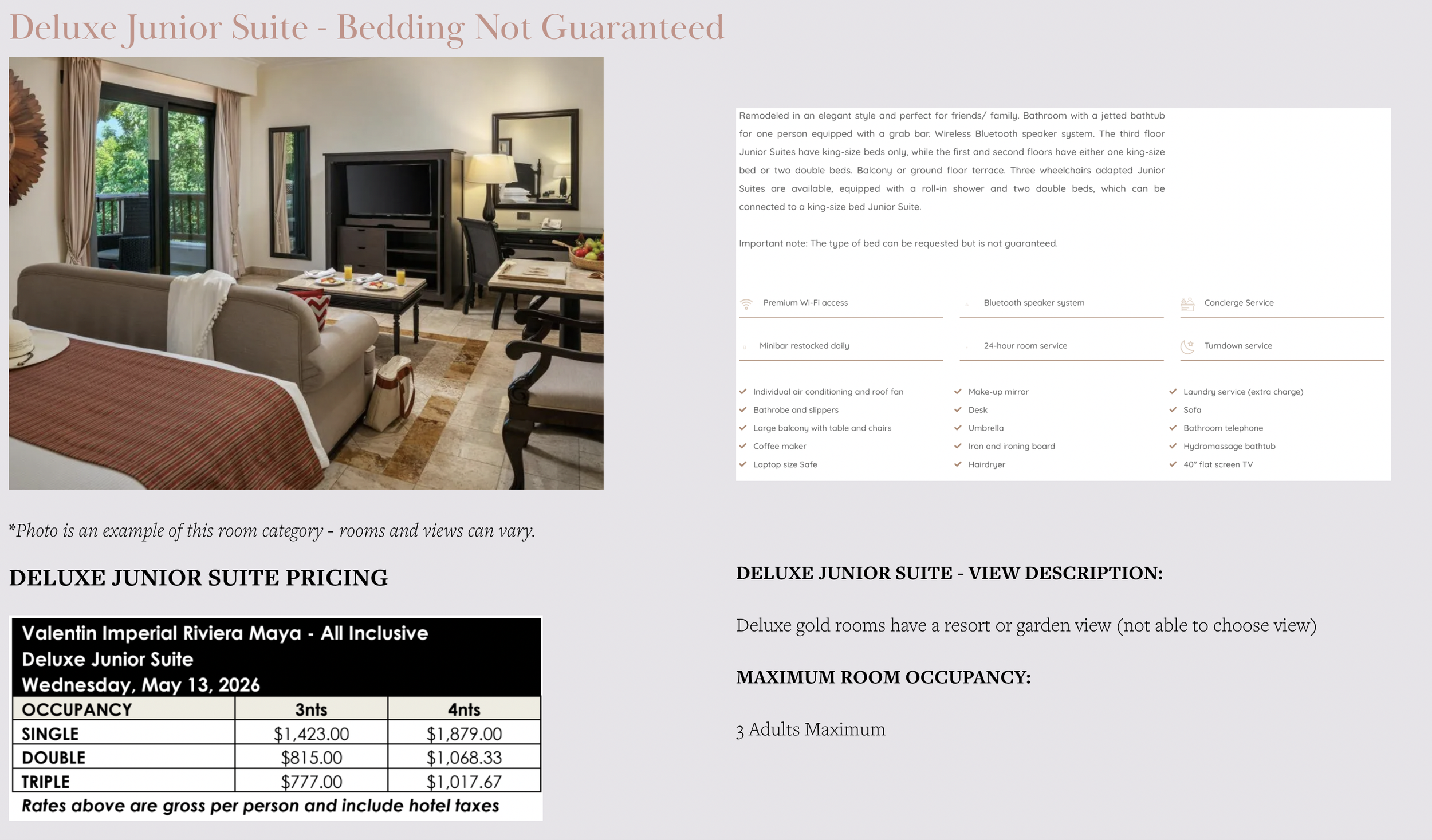 Please Note - Since this is an all inclusive resort, all guests coming to the resort MUST BE LISTED ON THE ROOM RESERVATION. If anyone is left off, when you arrive at the resort you will have to pay the current rate - not the group rate - or possibly purchase a second room if the additional guest puts you over the room occupancy. If the resort is sold out and is at their max resort occupancy level, it is possible the additional guests will not be permitted on the property at all.